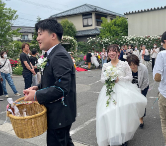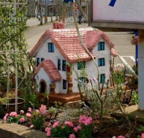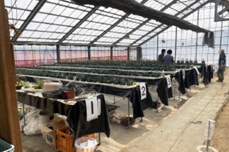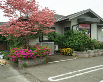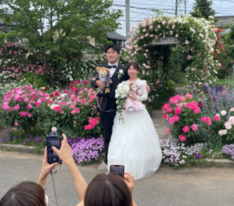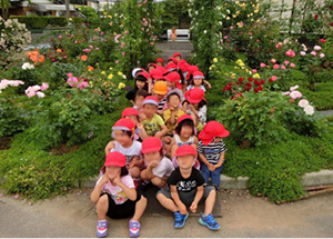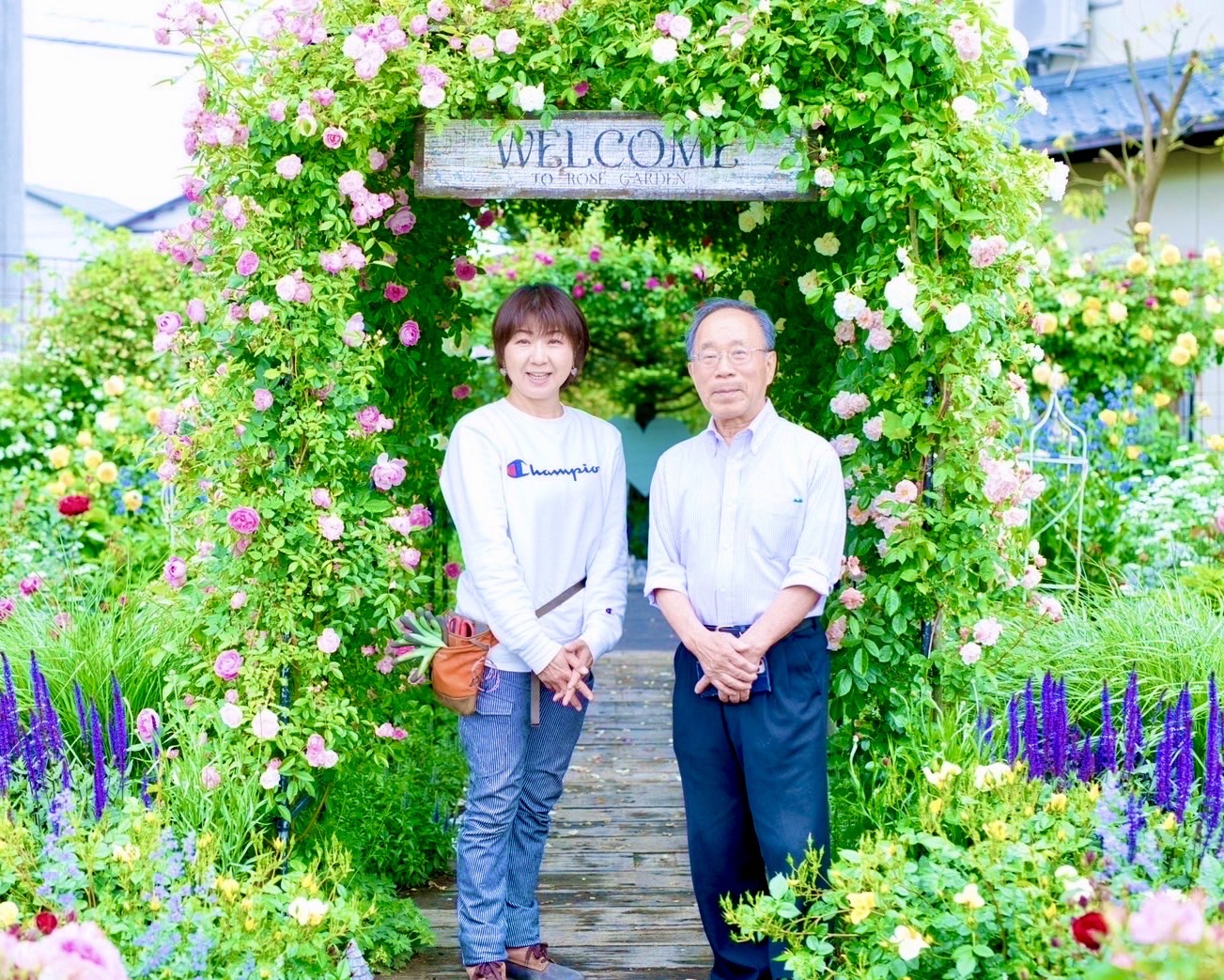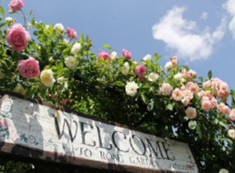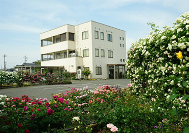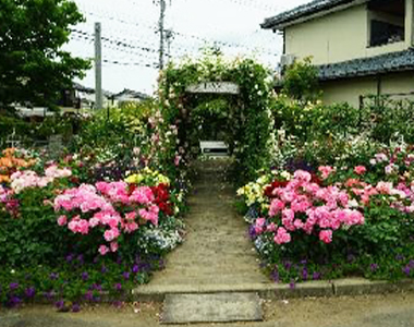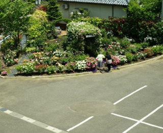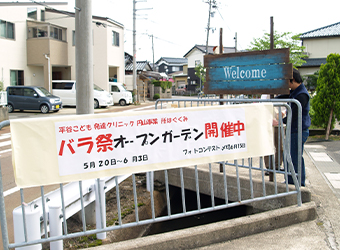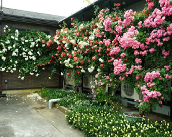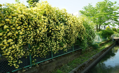 バラ園は施設の北側(玄関側)の駐車場と用水に面したフェンスを利用して作庭。