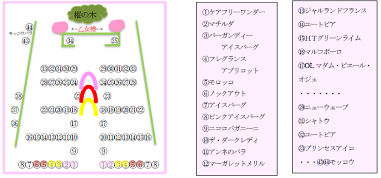 いずれも左右対象。黄緑線( )はつるバラのフェンスで全長50mに及ぶ。